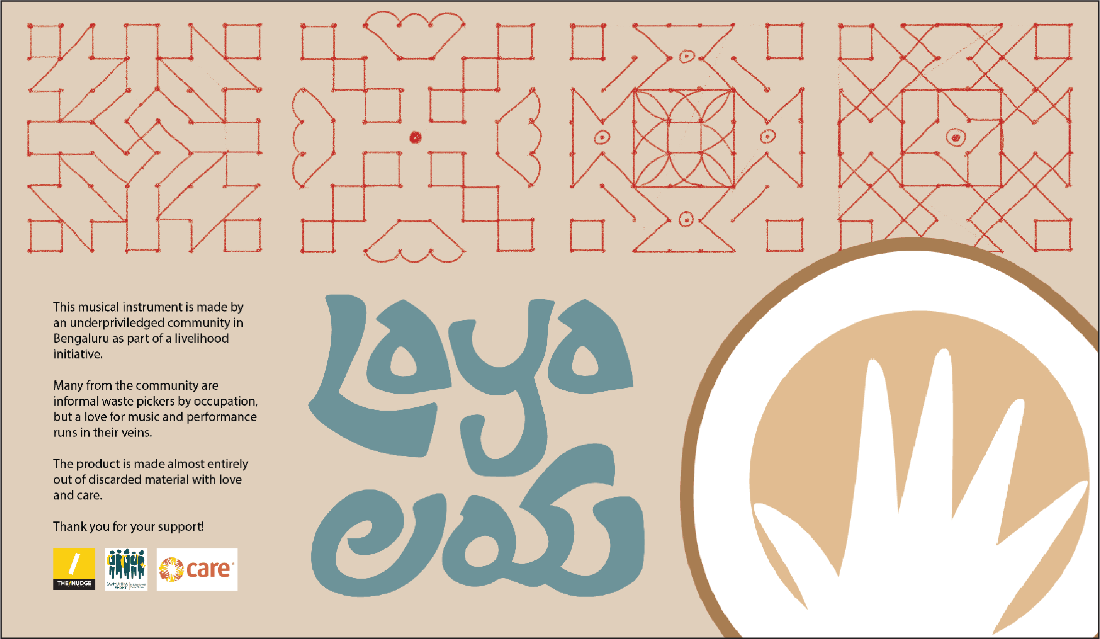 The brand uses local motifs (children's Kolams) and the project logo subtly references a hand on a drum head, visually affirming their artistic skill.