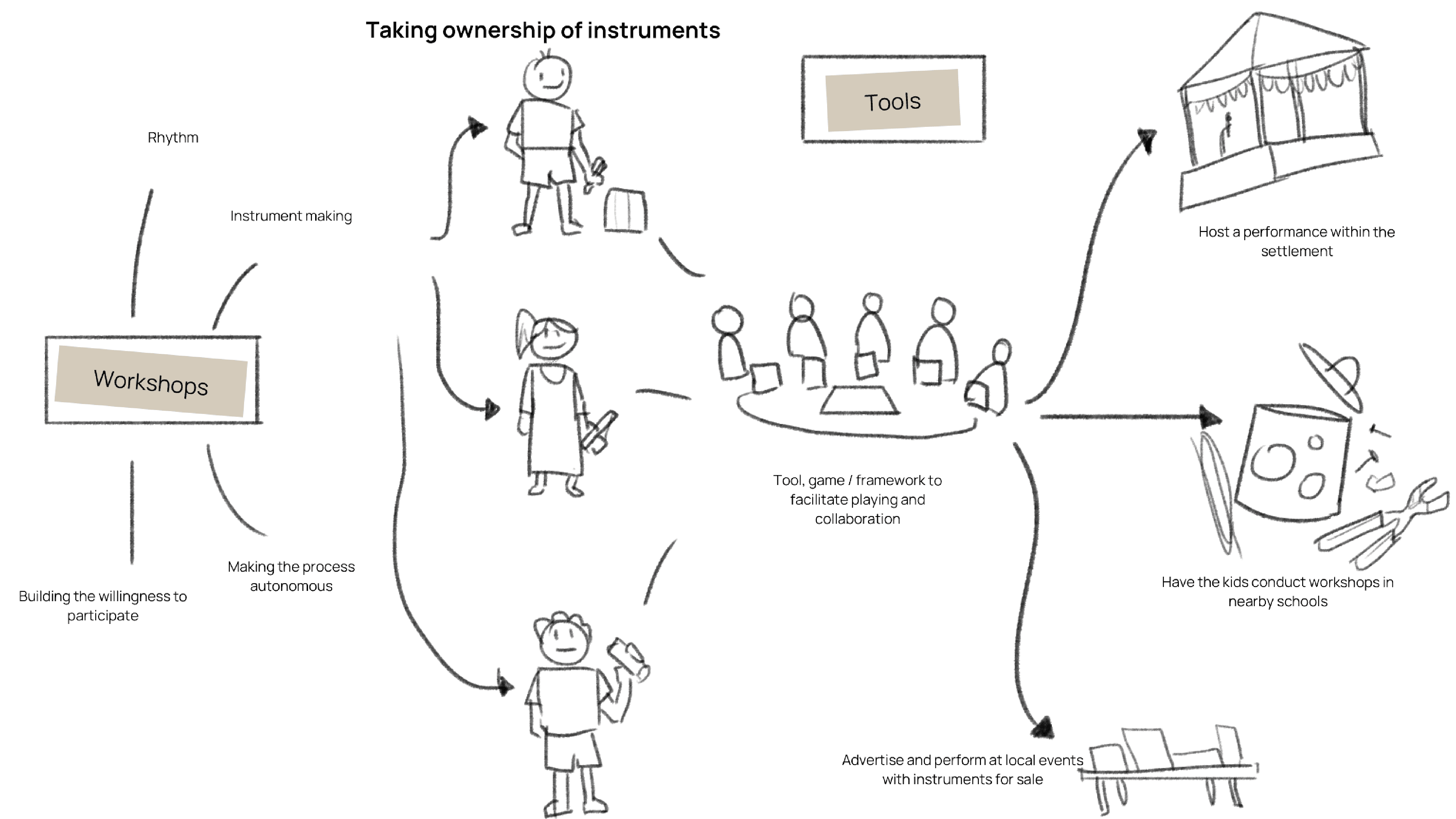 Instruments are crafted from collected waste, directly integrating the community's existing material expertise. |